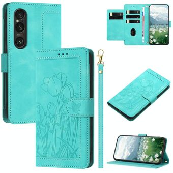 For Sony Xperia 1 VI Tulips Embossed Leather Phone Case with Lanyard(Green)