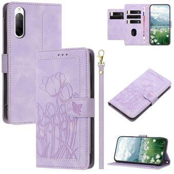 For Sony Xperia 10 V Tulips Embossed Leather Phone Case with Lanyard(Purple)