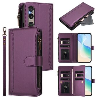 For Sony Xperia 5 V Magnetic Closure 9 Card Slots Zipper Leather Case with Hand Strap(Purple)