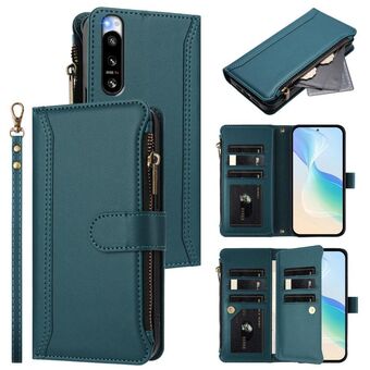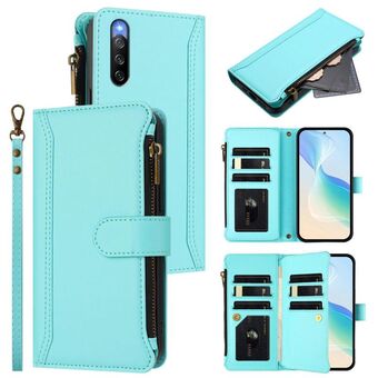 For Sony Xperia 10 IV Magnetic Closure 9 Card Slots Zipper Leather Case with Hand Strap(Turquoise)