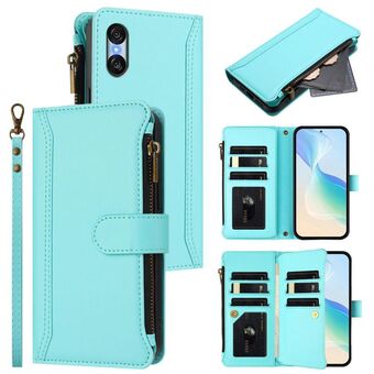 For Sony Xperia 10 V 2023 Magnetic Closure 9 Card Slots Zipper Leather Case with Hand Strap(Turquoise)