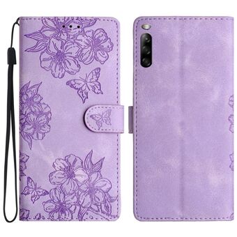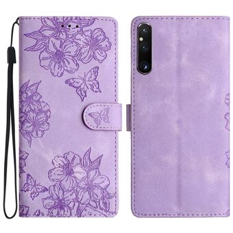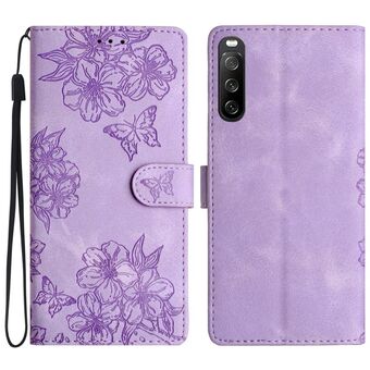 For Sony Xperia 10 V Cherry Blossom Butterfly Skin Feel Embossed PU Phone Case(Purple)