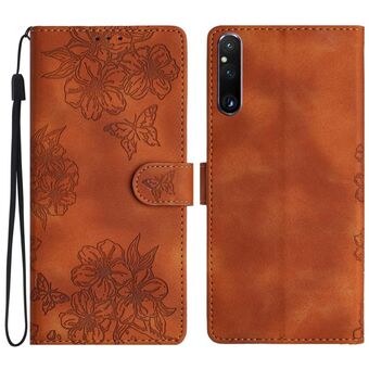 For Sony Xperia 5 Cherry Blossom Butterfly Skin Feel Embossed PU Phone Case(Brown)