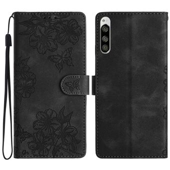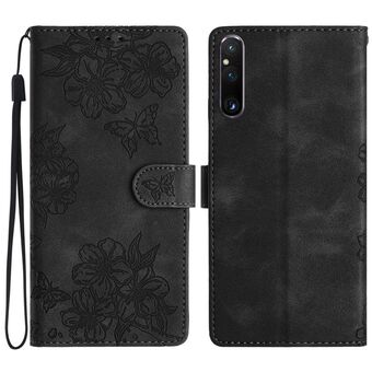 For Sony Xperia 5 Cherry Blossom Butterfly Skin Feel Embossed PU Phone Case(Black)