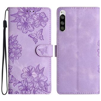 For Sony Xperia 5 Cherry Blossom Butterfly Skin Feel Embossed PU Phone Case(Purple)