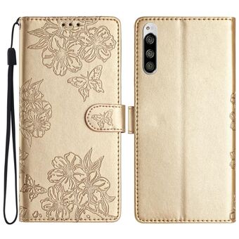For Sony Xperia 5 Cherry Blossom Butterfly Skin Feel Embossed PU Phone Case(Gold)