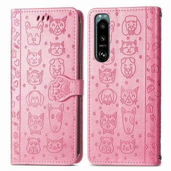 For Sony Xperia 5 IV Cat and Dog Embossed Leather Phone Case(Pink)