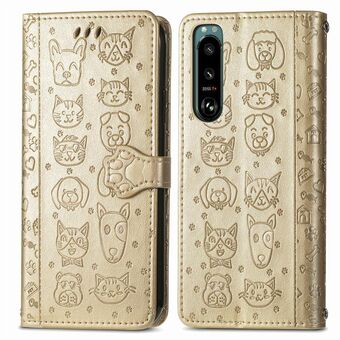 For Sony Xperia 5 IV Cat and Dog Embossed Leather Phone Case(Gold)