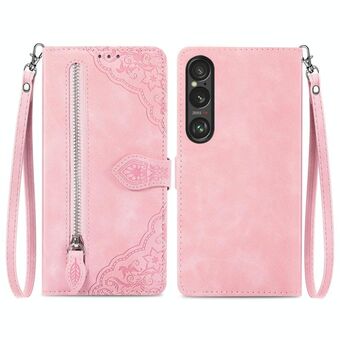 For Sony Xperia 1 VI Embossed Flower Zipper Leather Phone Case(Pink)