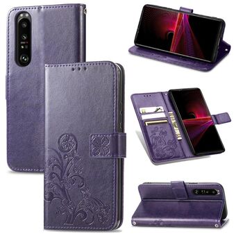 Για το Sony Xperia 1 III Four-leaf Clasp ανάγλυφη αγκράφα Κινητό τηλέφωνο προστασία δερμάτινη θήκη με κορδόνι & υποδοχή για κάρτες & πορτοφόλι & βραχίονα λειτουργία (μωβ)