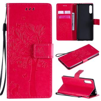 Για Sony Xperia L4 Tree & Cat ανάγλυφο μοτίβο οριζόντια Flip δερμάτινη θήκη με θήκη & υποδοχές για κάρτες & πορτοφόλι & κορδόνι (κόκκινο)