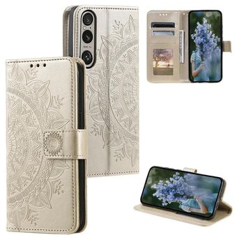 For Sony Xperia 1 VII Totem Flower Embossed Leather Phone Case with Lanyard(Gold)