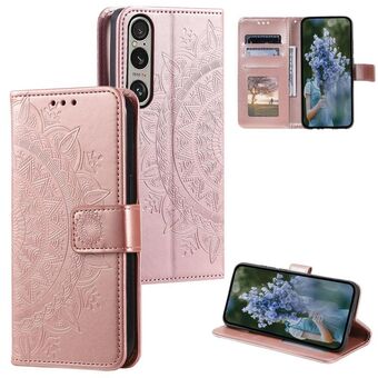 For Sony Xperia 1 VII Totem Flower Embossed Leather Phone Case with Lanyard(Rose Gold)