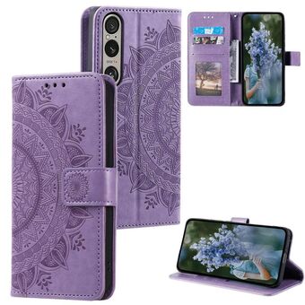 For Sony Xperia 1 VII Totem Flower Embossed Leather Phone Case with Lanyard(Purple)
