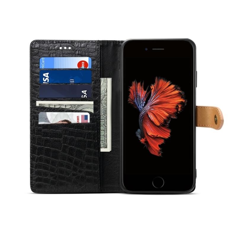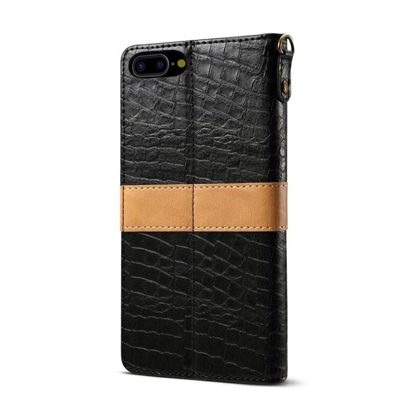 Θήκη βιβρίου από δέρμα PU με οριζόντιο άνοιγμα για iPhone 7 Plus / 8 Plus, με υφή κροκόδειλου, ραφές και πορτοφόλι, θήκη για κάρτες και λουρί (Μαύρο)