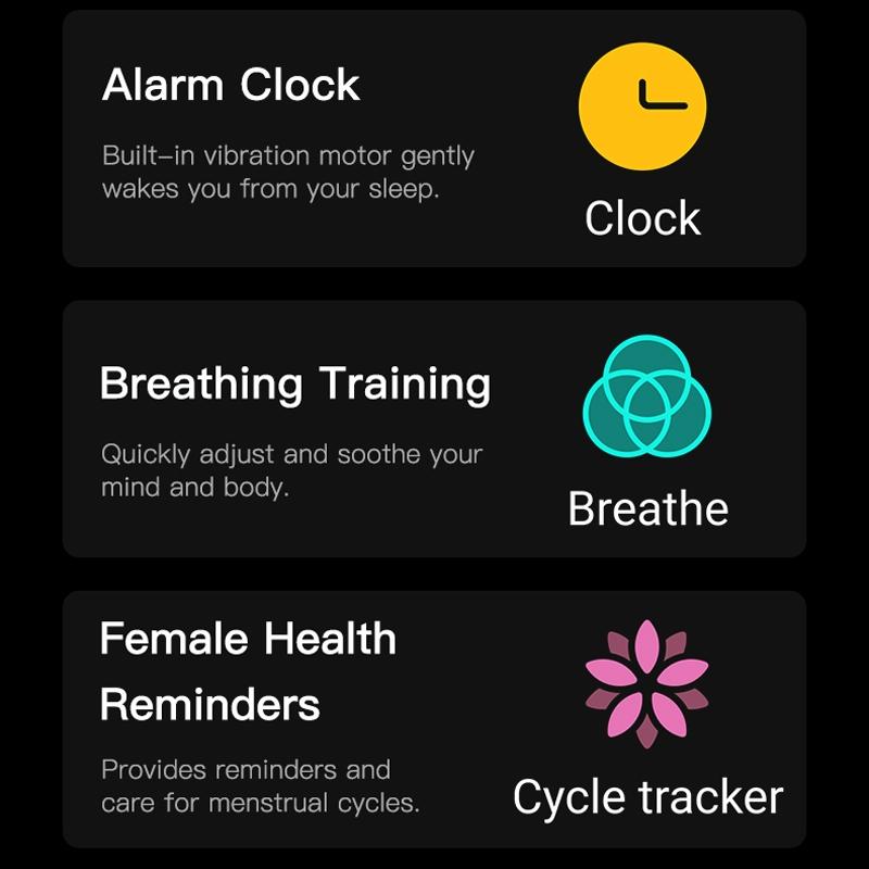 21. Other functions: Bluetooth call, synchronised number (support 10-digit), countdown, music control, find mobile phone, stopwatch, remote control photo, weather, screen brightness adjustment, sports track, always on screen saver, women health