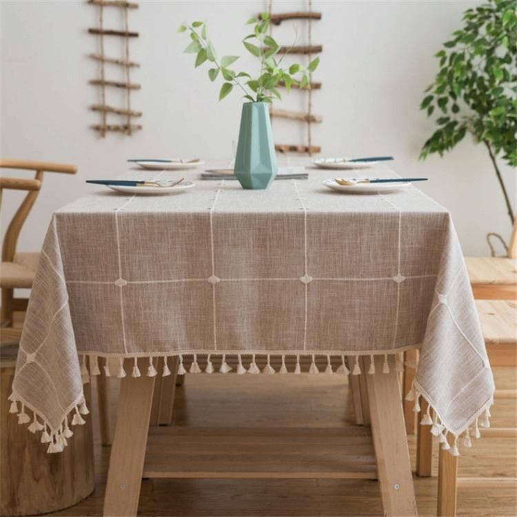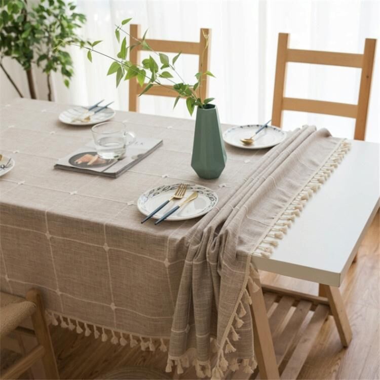 Τετράγωνο πλέγμα κεντημένο τραπεζομάντιλο καθαρό χρώμα βαμβάκι λινό φούντα ορθογώνιο τραπεζάκι καφέ, μέγεθος: 140x300cm (καφέ)