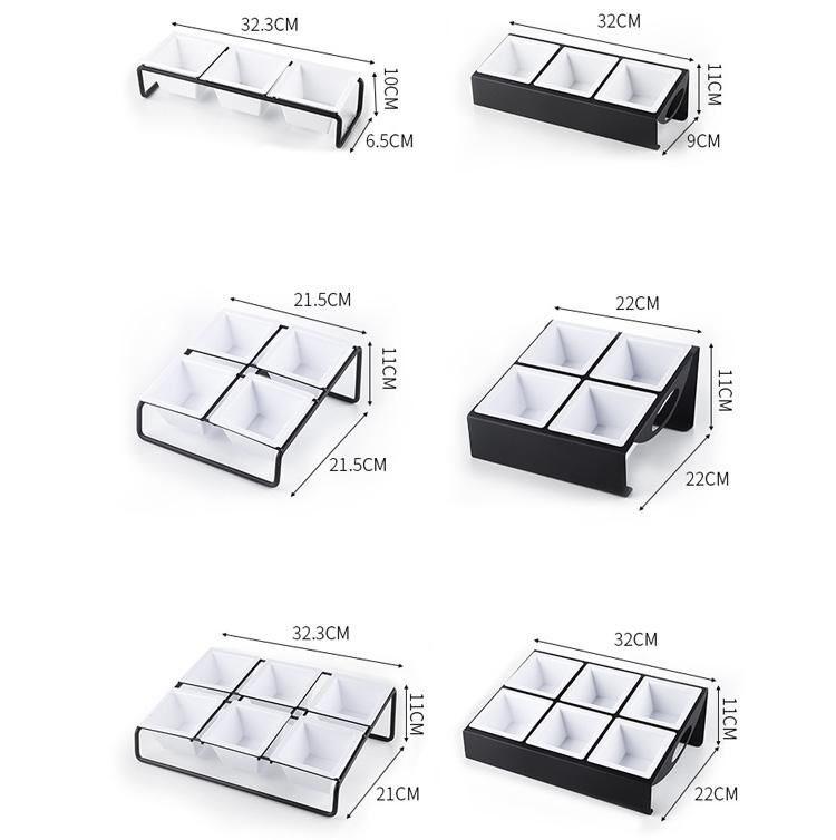 7. Dimensions: Type A 3 compartments: 32.3 x 6.5 x 10 cm, Type A 4 compartments: 21.5 x 21.5 x 11 cm, Type A 6 compartments: 32.3 x 21 x 11 cm, Type B 3 compartments: 32 x 9 x 11 cm, 4 compartments for type B: 22 x 22 x 11 cm, 6 compartments for type B: 32 x 22 x 11 cm