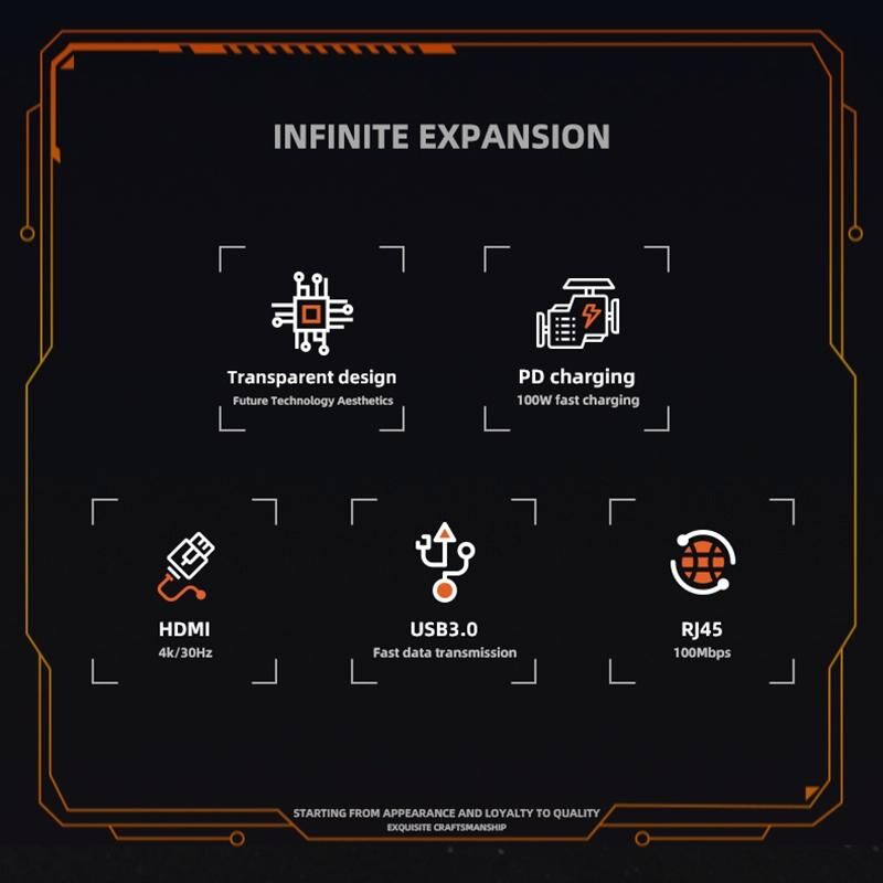 Output interface: HDMI: 4K 30Hz, RJ45: 100Mbps, PD3.0: 100W+Data 2-in-1, USB3.0: 5Gbps, USB2.0: 480Mbp