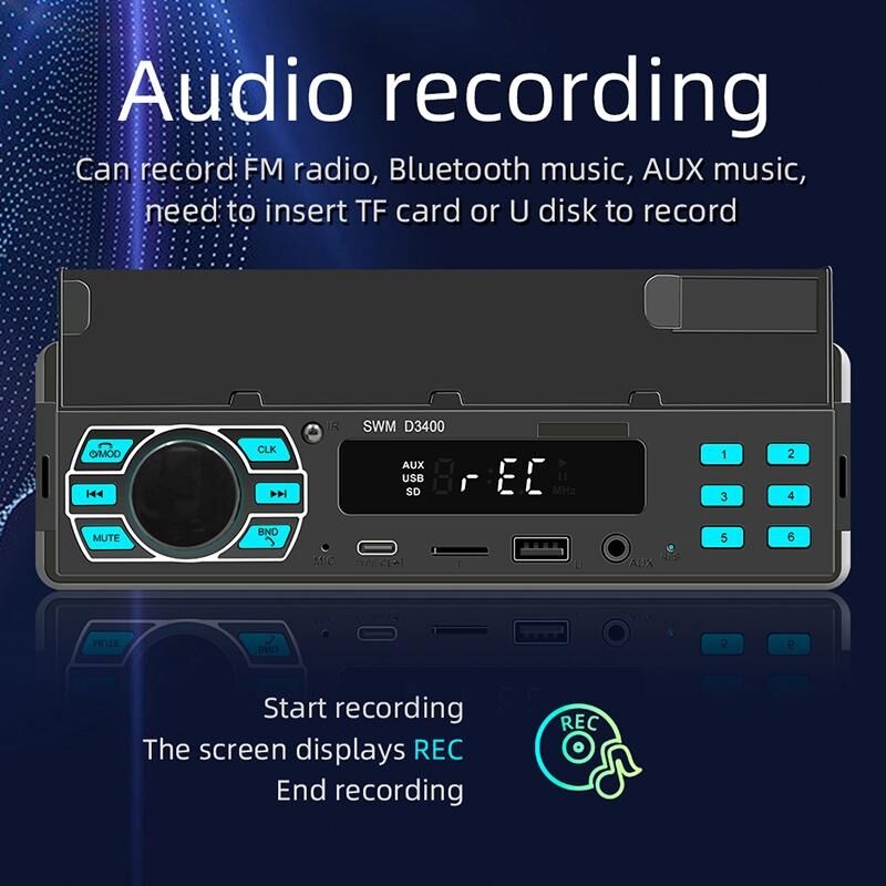 6. Audio source copy function (when a U disk or TF card is inserted, press and hold the knob in radio, BT music, AUX mode, and the current favorite audio or radio station can be stored in the TF card or U disk for easy playback next time listen)