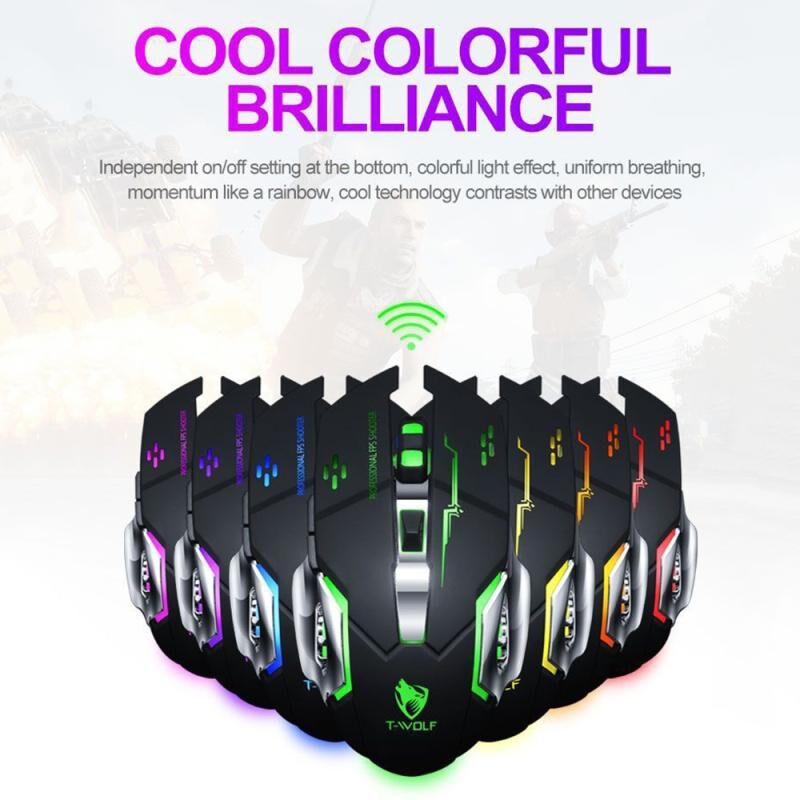 T-WOLF Q13 ασύρματο ποντίκι gaming 2.4GHz με 6 κουμπιά και πολύχρωμο φωτισμό RGB, Χρώμα: Μαύρο μονής λειτουργίας (T-WOLF)