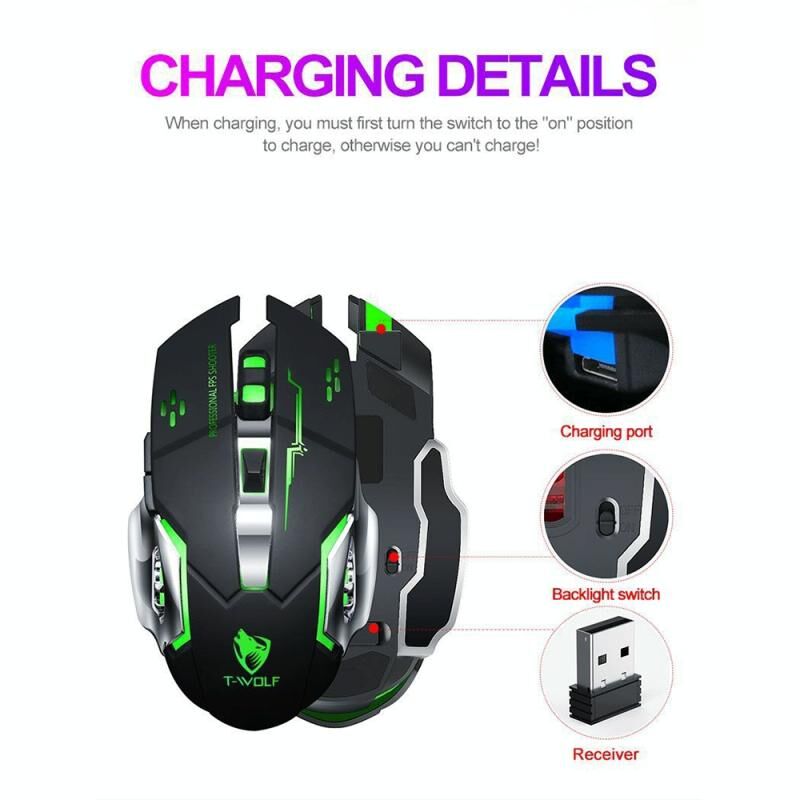 T-WOLF Q13 ασύρματο ποντίκι gaming 2.4GHz με 6 κουμπιά και πολύχρωμο φωτισμό RGB, Χρώμα: Μαύρο Αστέρι Μονής Λειτουργίας (T-WOLF)