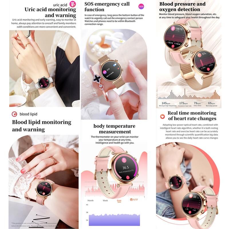 1. Λειτουργικά σημεία: Χρυσός θηλυκός σύνδεσμος διαμέτρου 40mm, επικοινωνία Bluetooth, γυναικεία υγεία (λειτουργία φυσιολογικού κύκλου), μη επεμβατική μέτρηση γλυκόζης αίματος, μέτρηση ουρικού οξέος, παρακολούθηση λιπιδίων αίματος, λειτουργία SOS για έκτακτες ανάγκες, παρακολούθηση θερμοκρασίας, παρακολούθηση οξυγόνου αίματος, εκπαίδευση αναπνοής, παρακολούθηση καρδιακού ρυθμού, παρακολούθηση αρτηριακής πίεσης, παρακολούθηση ύπνου, υπενθύμιση καθιστικής ζωής και άλλες λειτουργίες υγείας, έξυπνος φωνητικός βοηθός, λειτουργία απομακρυσμένης φροντίδας για οικογένεια και φίλους, πρόγνωση καιρού.