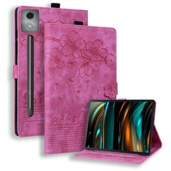 For Lenovo Tab M9 Cartoon Sakura Cat Embossed Leather Tablet Case(Rose Red)