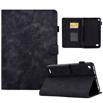 For Amazon Kindle Fire 7 2019/2017/2015 Peony Butterfly Embossed Leather Smart Tablet Case(Black)