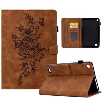 For Amazon Kindle Fire HD8 2018/2017/2016 Peony Butterfly Embossed Leather Smart Tablet Case(Brown)