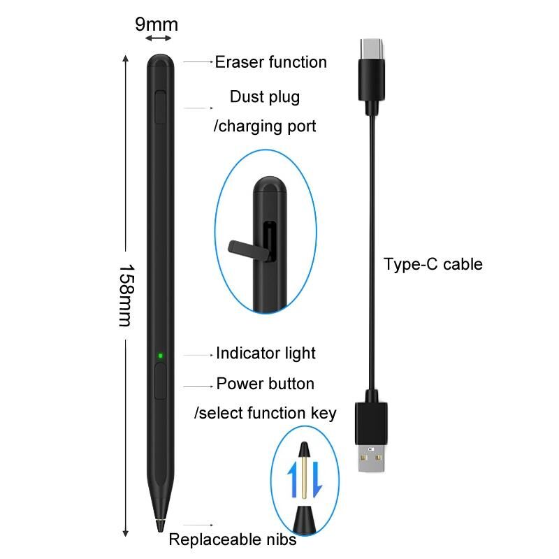 9. Packing list: stylus x 1, replacement POM nib x 1, charging cable x 1
