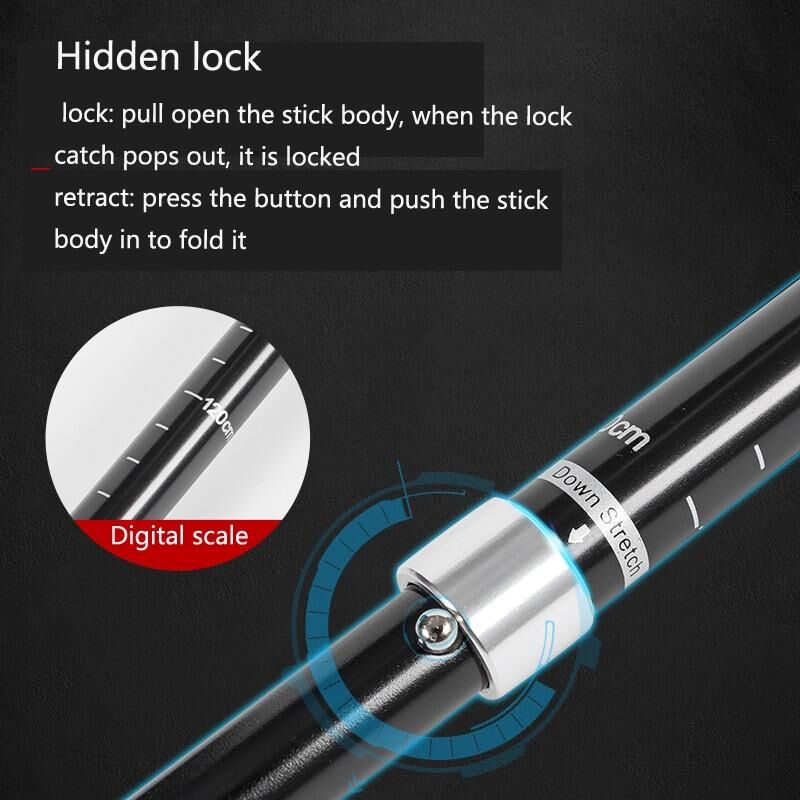 4. Hidden lock: lock: pull open the stick body, when the lock catch pops out, it is locked, retract: press the button and push the stick body in to fold it