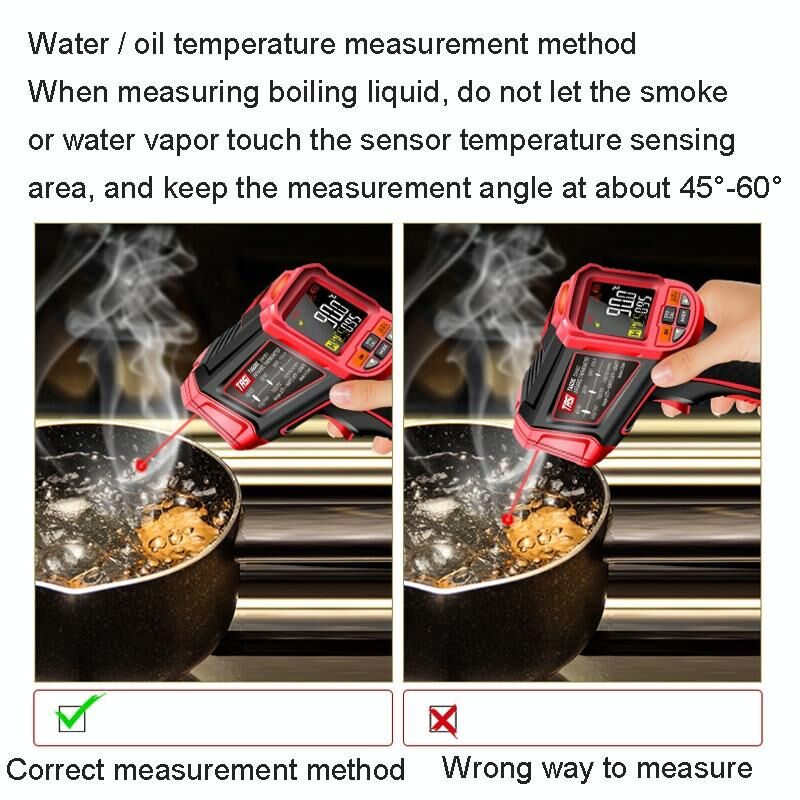 7. Water temperature / oil temperature measurement method: measurement of boiling liquid, do not let the smoke or water vapor contact the sensor temperature sensing area, measurement angle to maintain at about 45-60 degrees