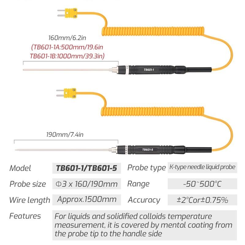 - TB601-1/ TB601-5: for liquid and solidified colloid temperature measurement tip to the grip with metal coating protection