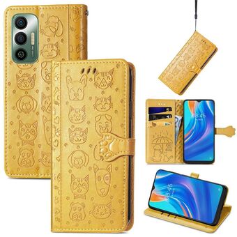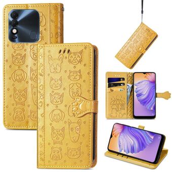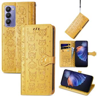 For Tecno Spark 8 Cat and Dog Embossed Leather Phone Case(Yellow)