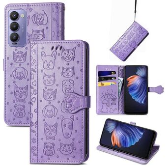 For Tecno Camon 18 Cat and Dog Embossed Leather Phone Case(Purple)