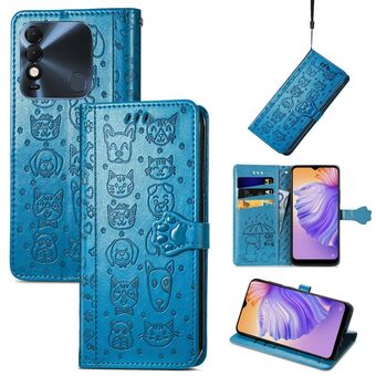 For Tecno Spark 8 Cat and Dog Embossed Leather Phone Case(Blue)