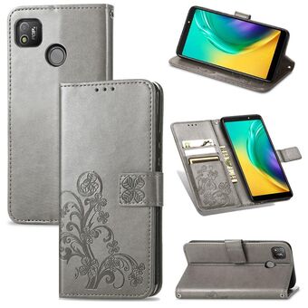 Θήκη δερμάτινη προστασίας κινητού τηλεφώνου για Tecno POP 4 Pro με κουμπωτό κούμπωμα σε σχήμα τριφυλλιού, ανάγλυφο, με κορδόνι, θήκη για κάρτες, πορτοφόλι και λειτουργία βάσης (Χρυσό Ρόδι)