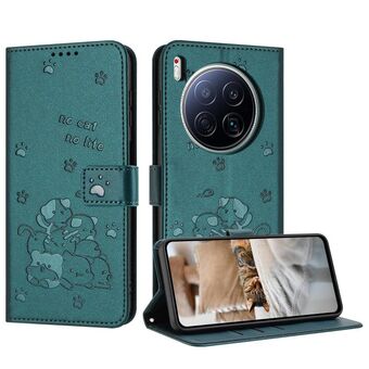 For Tecno Camon 40 4G Embossed Kitten Phone Leather Case with Lanyard(Dark Green)