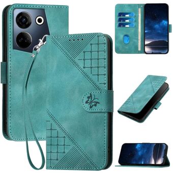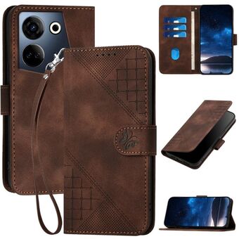 For Tecno Pova 3 Grid Butterfly Embossed Pattern Leather Phone Case with Lanyard(Coffee)