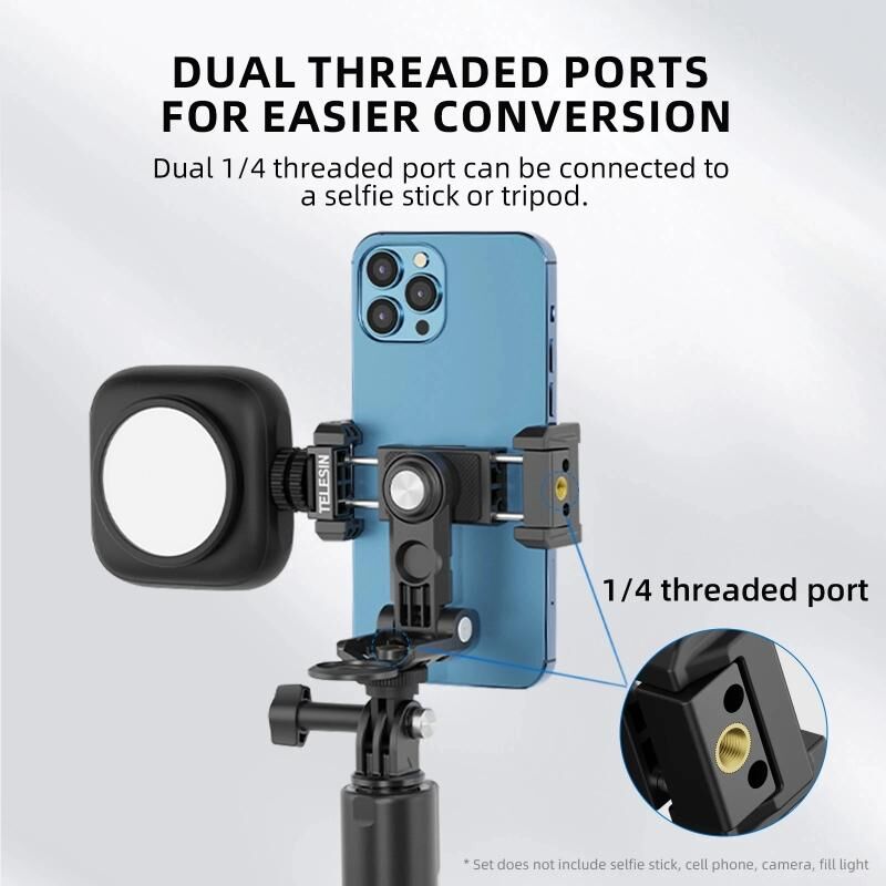 5. Διπλή διεπαφή σπειρώματος, πιο βολική για μεταφορά. Το κύριο σώμα του κλιπ και το κάτω μέρος της αναδιπλούμενης βάσης είναι εξοπλισμένα με οπές σπειρώματος 1/4, οι οποίες μπορούν να μεταφερθούν σε ένα ραβδί selfie ή τρίποδο.