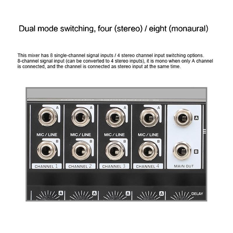 2. There are 8 mono signal input, can be switched to 4 groups of stereo input, each signal input can be adjusted independently.