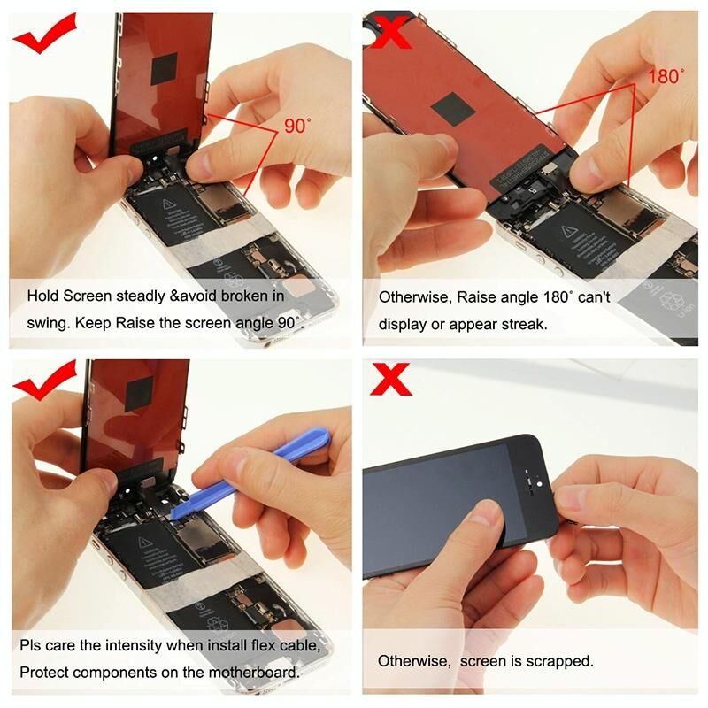 Screen replacement is very fragile product. We strongly suggest test before installation. Please simulates testing, which means mobile phone apart, (motherboard + LCD or screen) connected audio cable and new replacement, power on, test finished. If test OK, please install it. If it can not show, please contact us at the very first time. And please do not force it to be installed in mobile phone. We will not be responsible once the screen is installed.