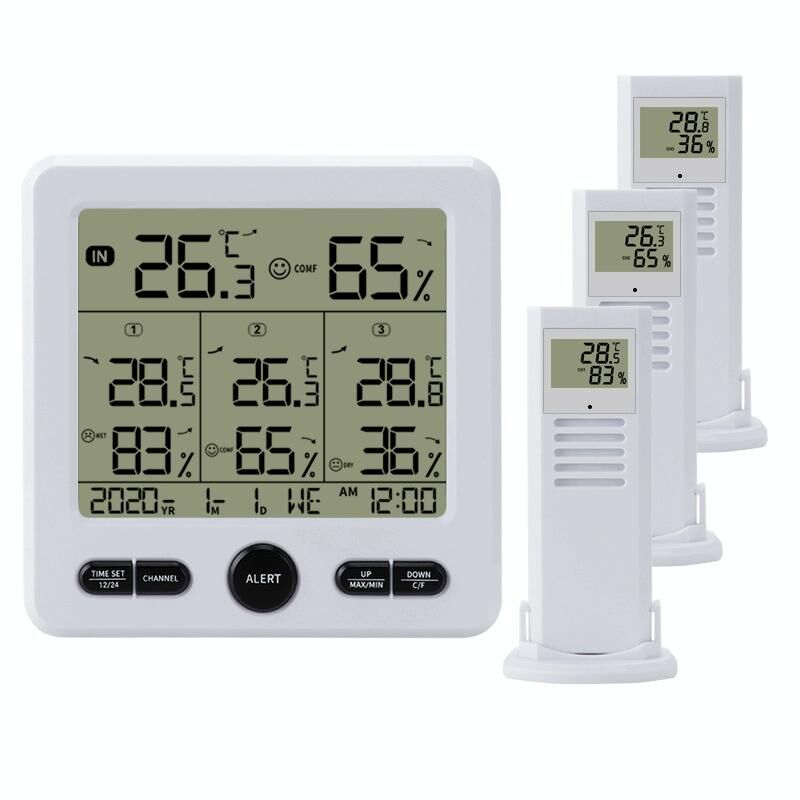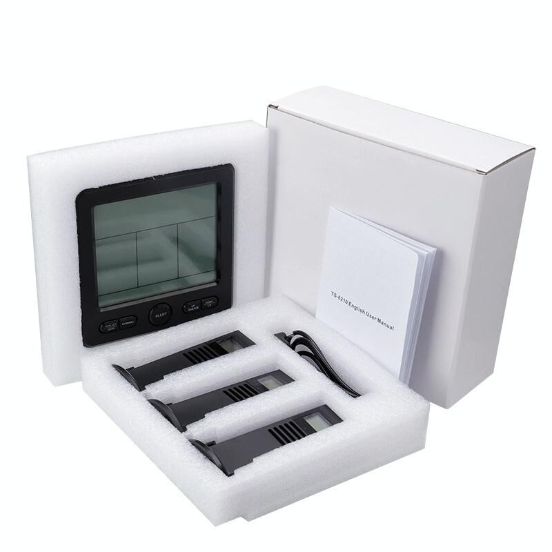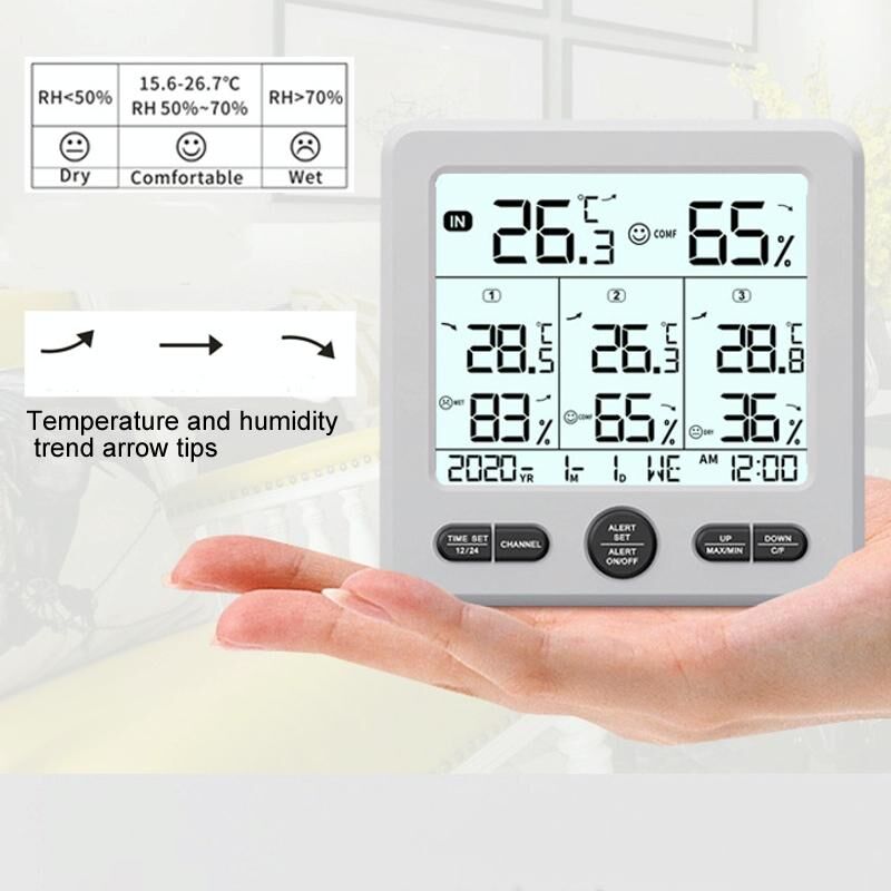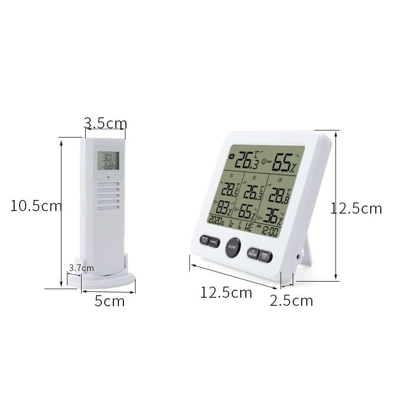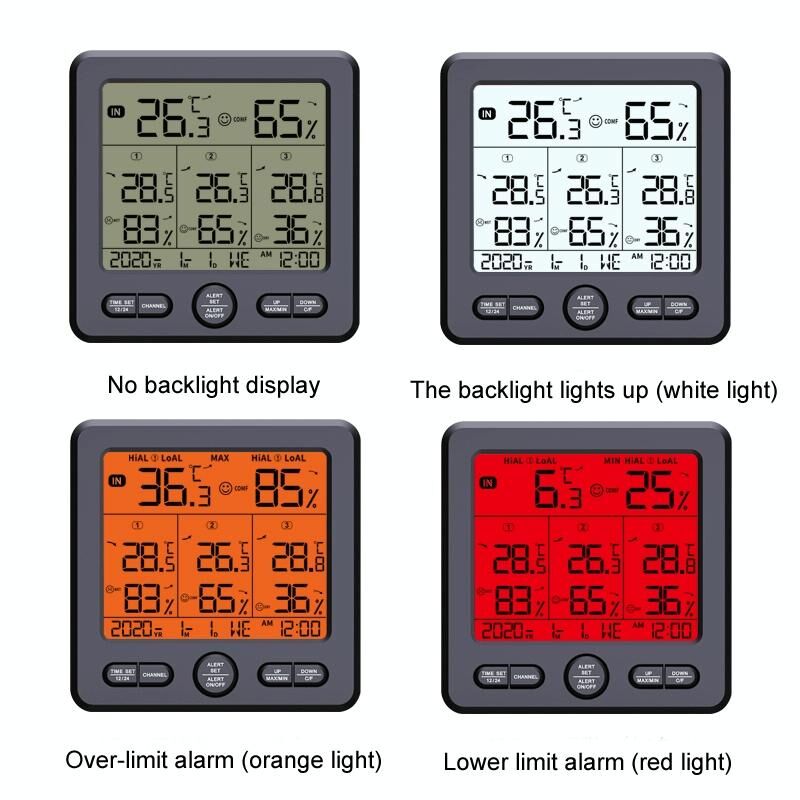 5. When the temperature and humidity exceed the set upper and lower limits, the receiver will send out corresponding color alarms and beep beeps.