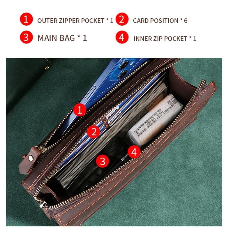 4. Εσωτερική δομή τσάντας: εξωτερική τσέπη φερμουάρ x 1, υποδοχή για κάρτες x 6, κύρια τσέπη x 1, εσωτερική τσέπη φερμουάρ x 1,