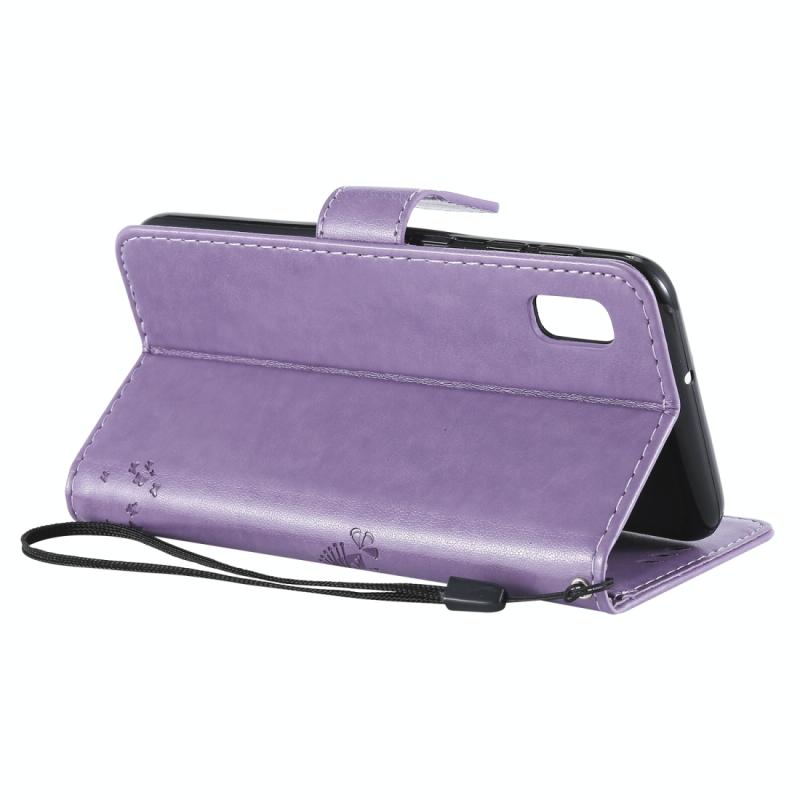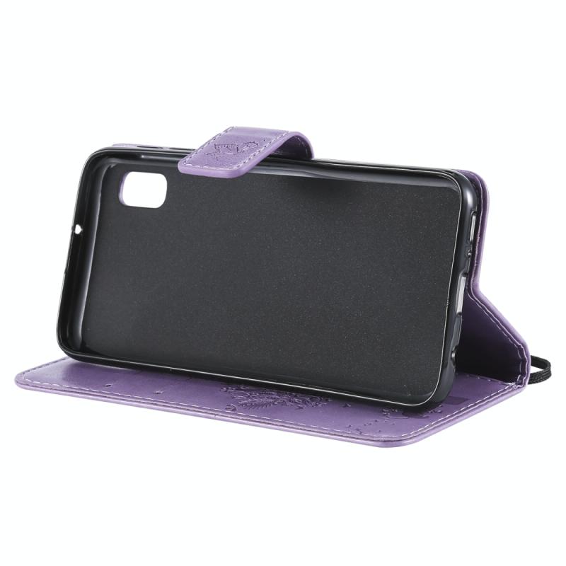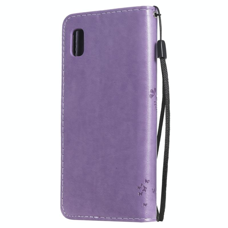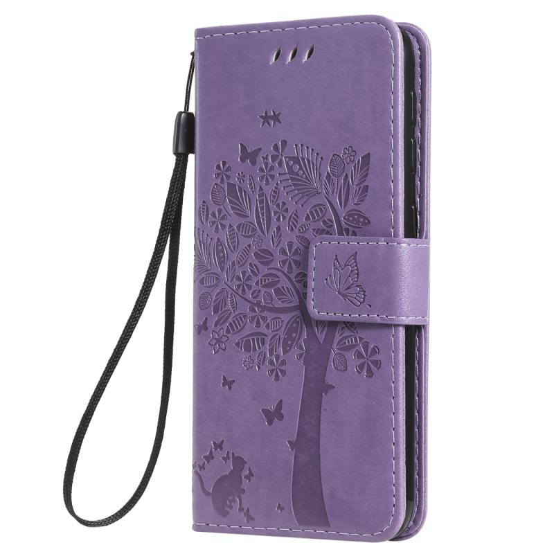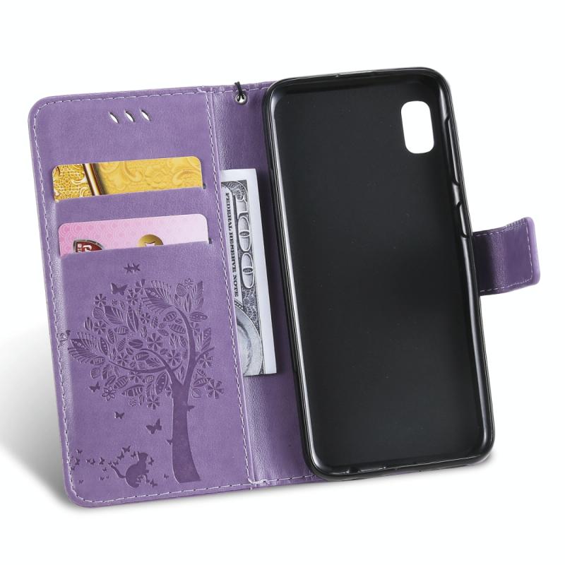 Θήκη δερμάτινη PU με σχέδιο δέντρου & γάτας, με εκτύπωση, οριζόντιο άνοιγμα, με βάση, θήκες καρτών, πορτοφόλι & λουρί για Galaxy A10e (Μωβ)