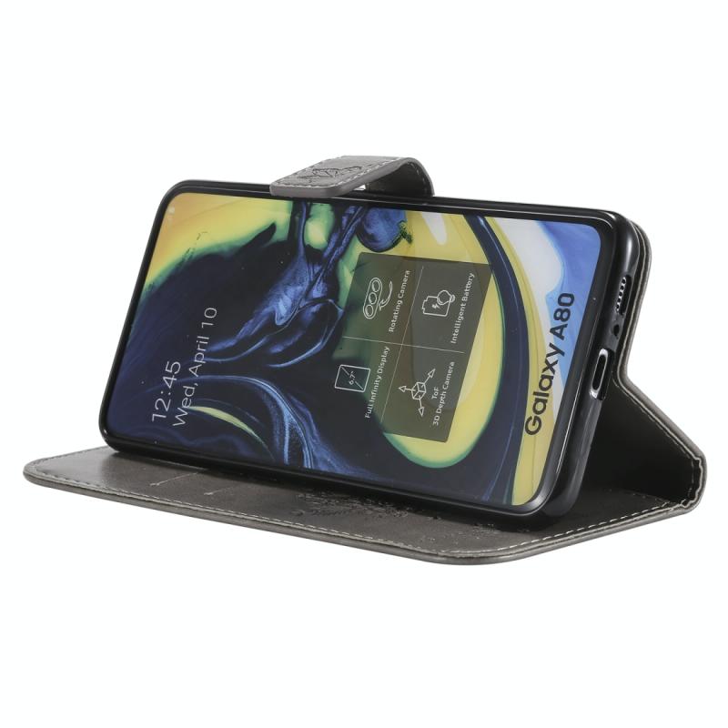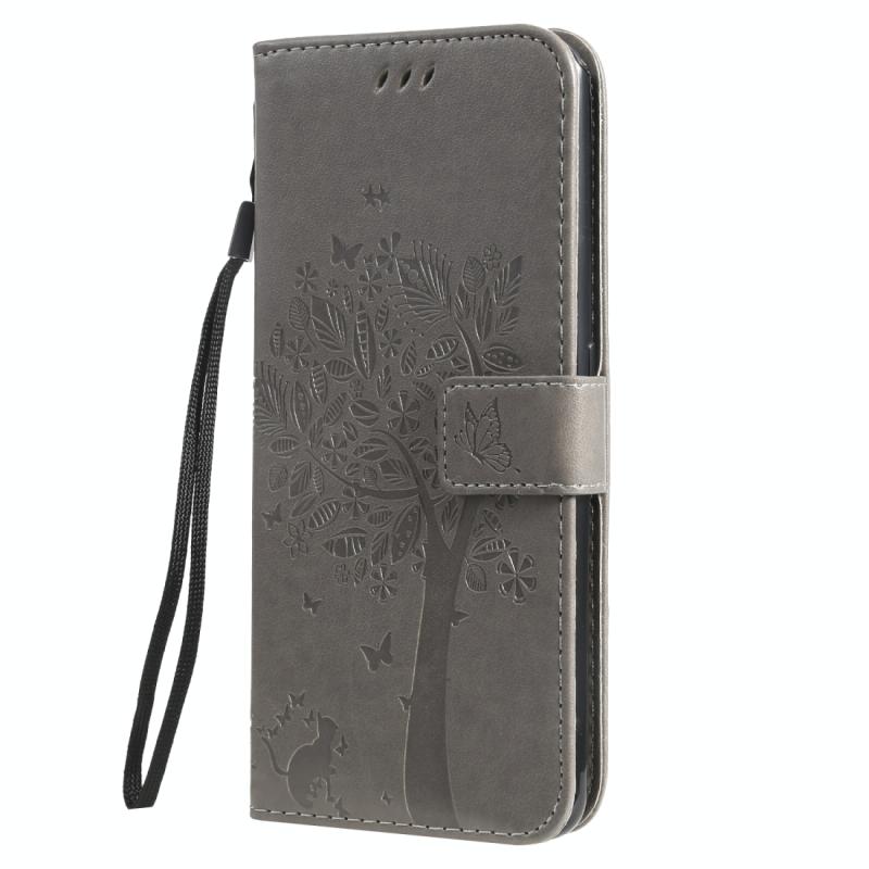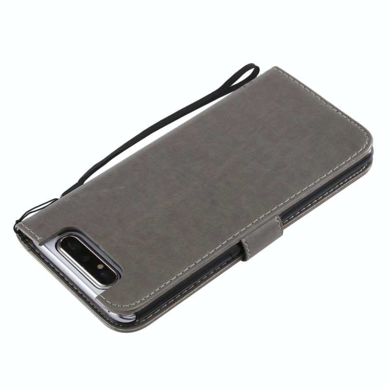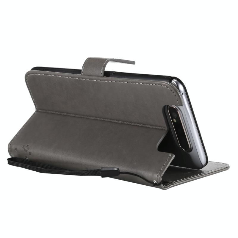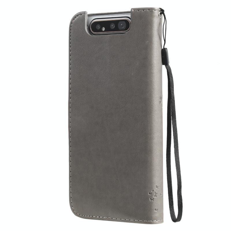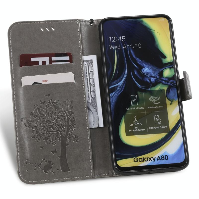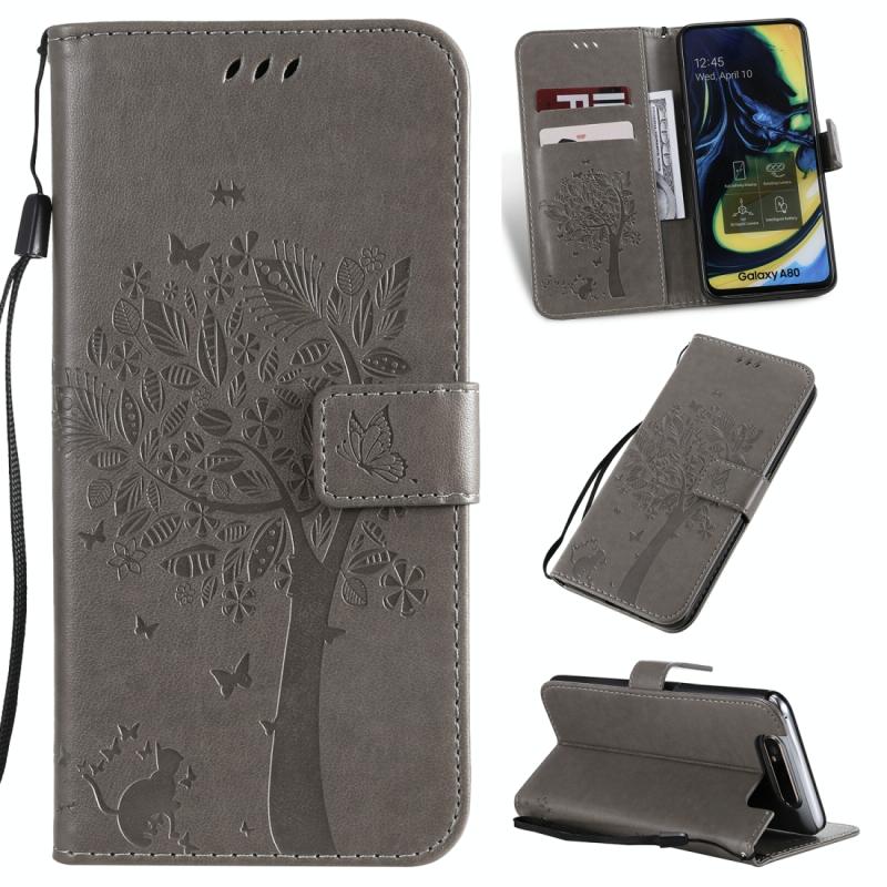 Tree & Cat Pattern Pressed Printing Horizontal Flip PU Leather Case with Holder & Card Slots & Wallet & Lanyard For Galaxy A80(Grey)