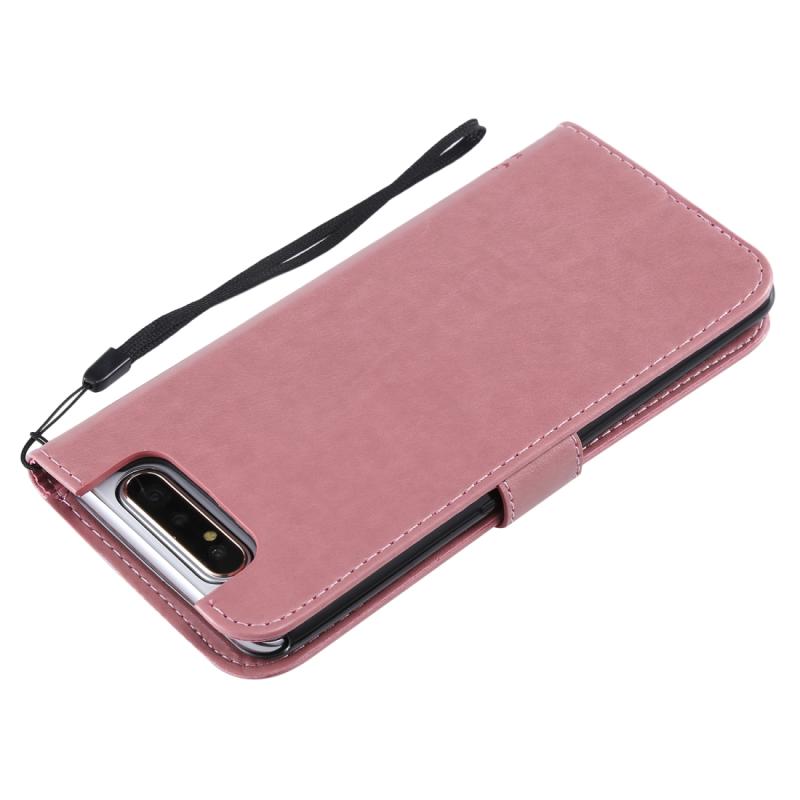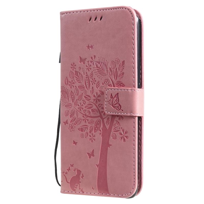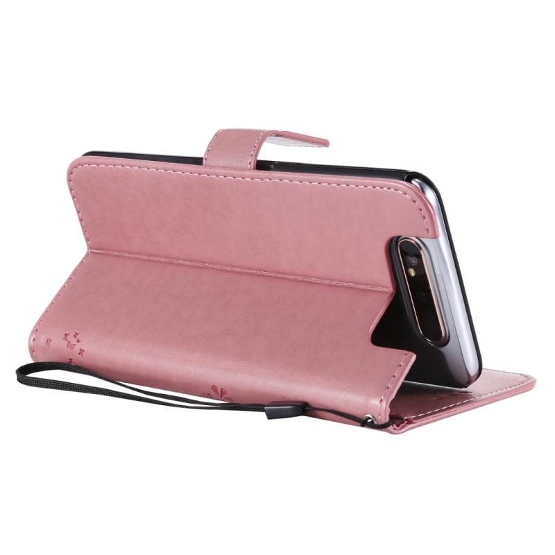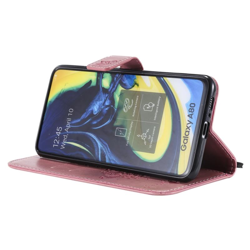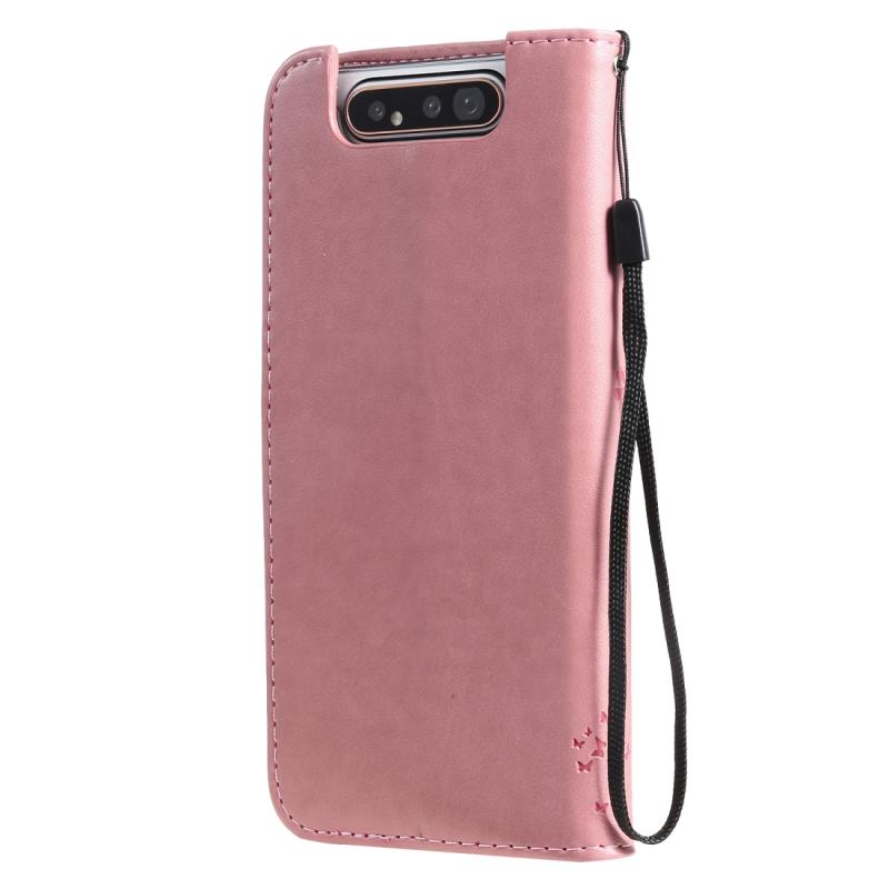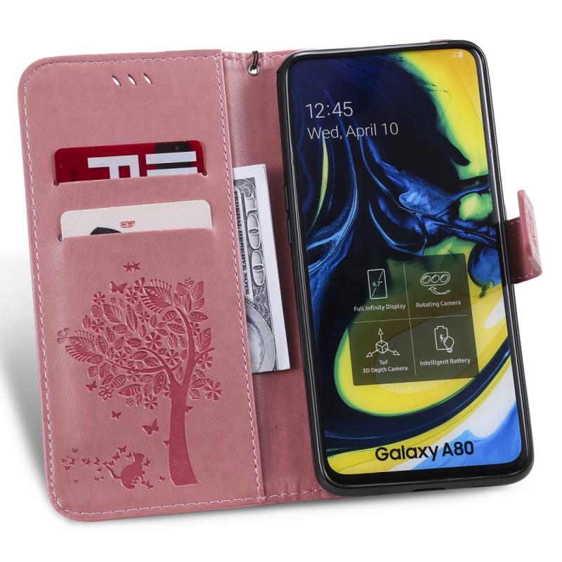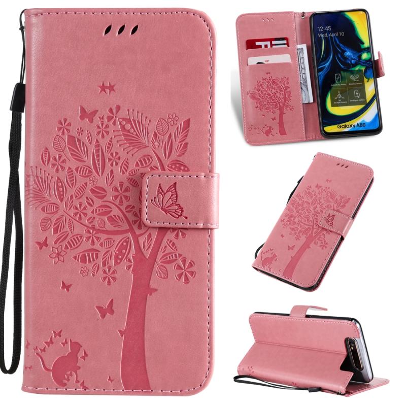 Tree & Cat Pattern Pressed Printing Horizontal Flip PU Leather Case with Holder & Card Slots & Wallet & Lanyard For Galaxy A80(Pink)