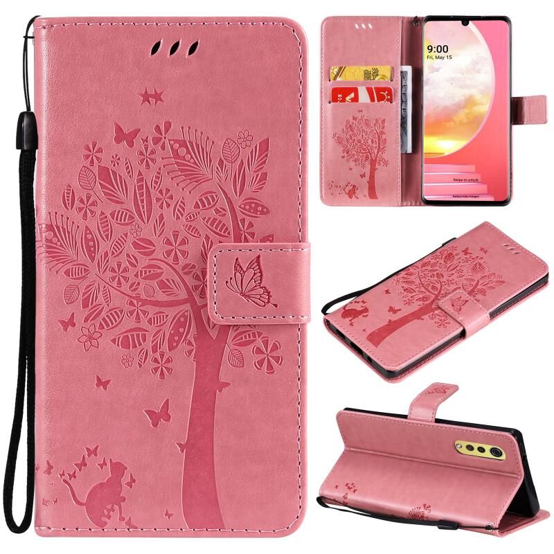 Θήκη δερμάτινη PU με σχέδιο δέντρου & γάτας, με εκτύπωση, οριζόντιο άνοιγμα, βάση στήριξης, θήκες για κάρτες, πορτοφόλι & λουρί για LG Velvet 2 Pro (ρόζ)
