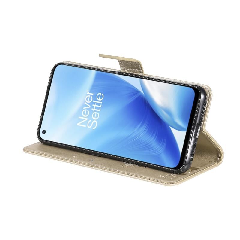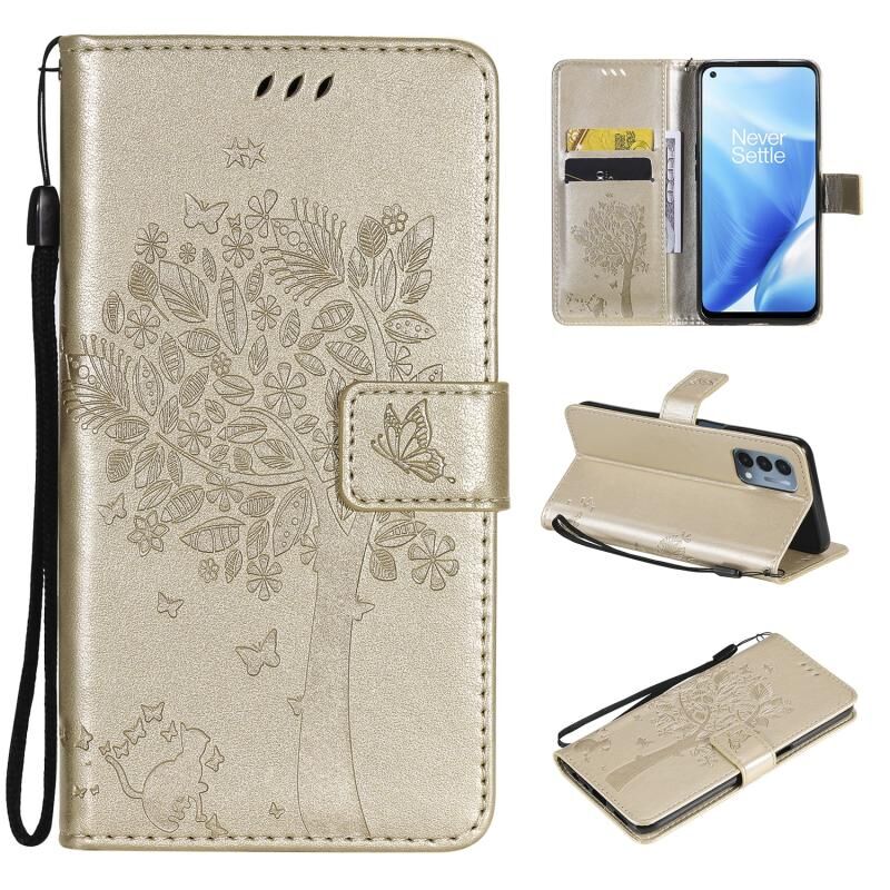 Θήκη δερματίνης PU με σχέδιο δέντρου & γάτας, εκτύπωση με θερμοτύπηση, οριζόντια αναστροφή, με βάση στήριξης & θήκες καρτών & πορτοφόλι & κορδόνι για OnePlus N200 5G (Πράσινο)